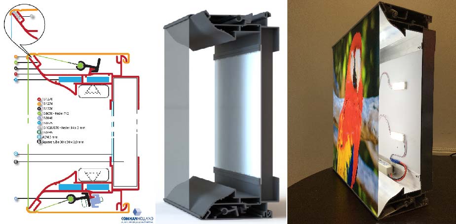 Sistēmu veido viegli montējama, funkcionāla sistēma, kuru samontējot, ārpusē nav redzami savienojuma elementi. Šī sistēma, neizārdot pašu gaismas kasti, ļauj bez lielām pūlēm daudzas reizes mainīt reklāmas attēlu. Atliecot virsējo virināmo gaismas kastes daļu, reklāma var tikt mainīta ļoti ātri un vienkārši.