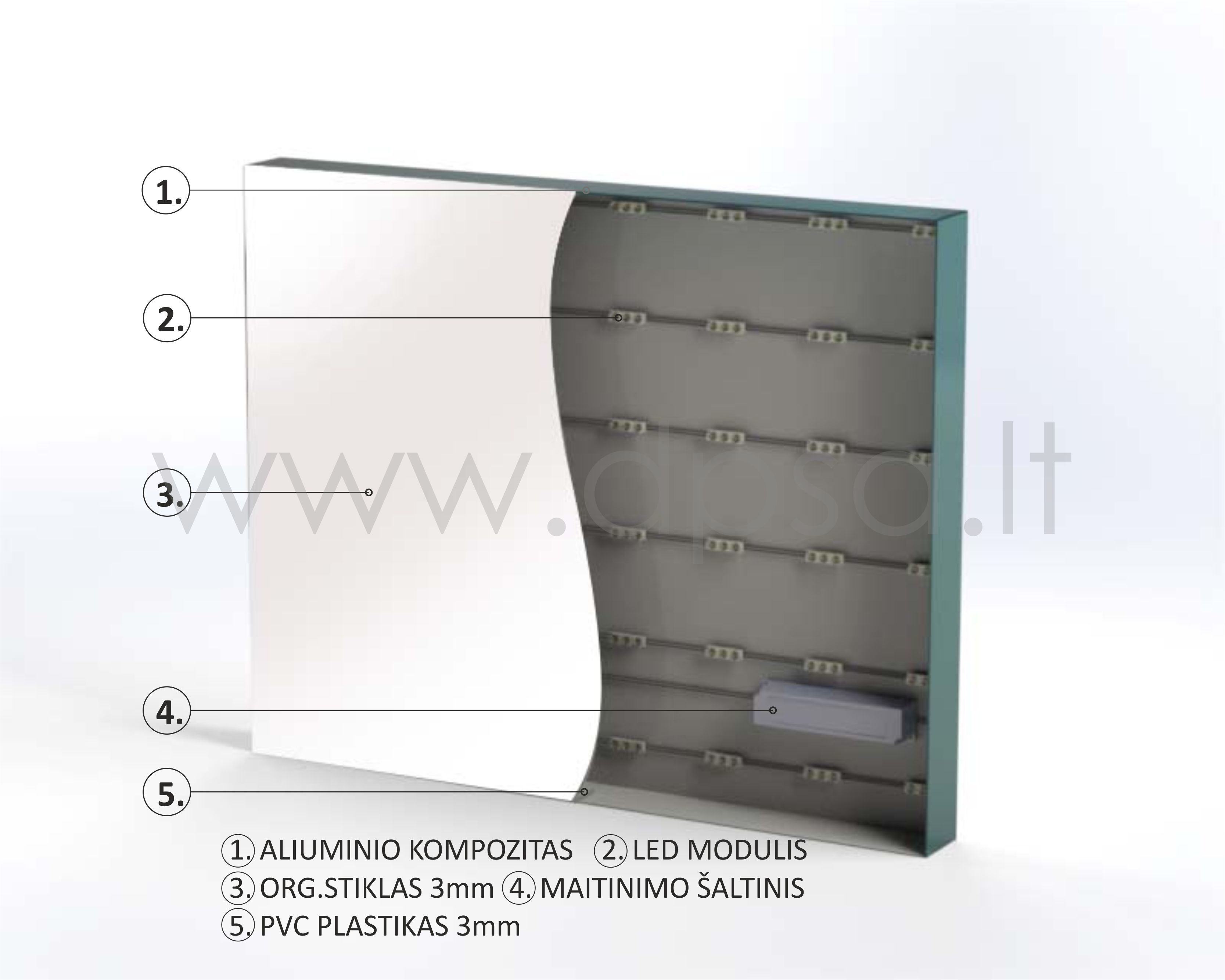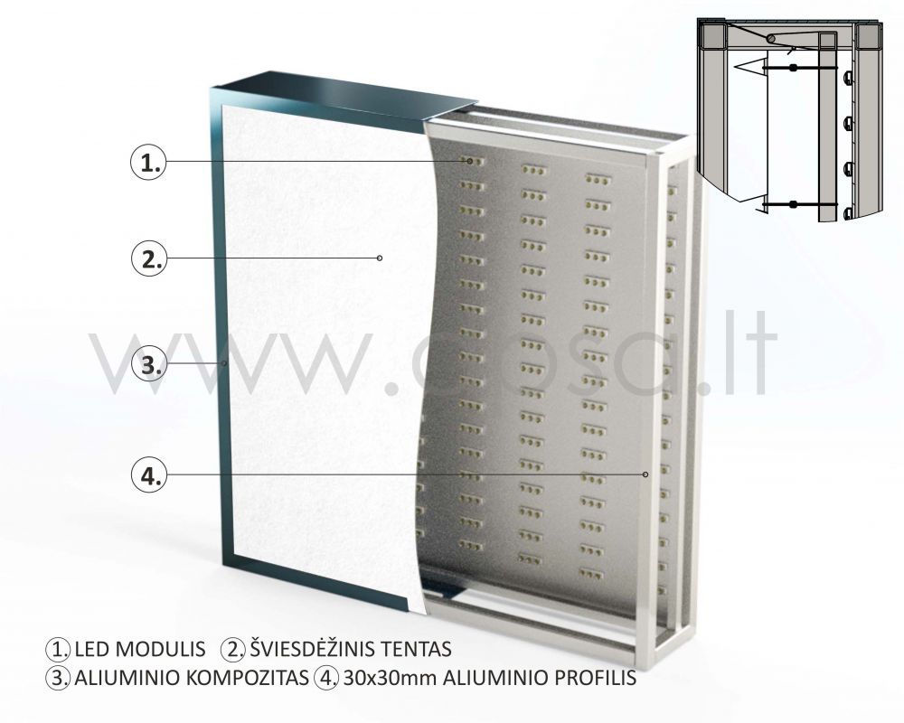 Sistēmu veido LED modulis, gaismas kastu tents, alumīnija kompozīts, alumīnija profils.